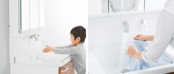 手前に向ければお子様も使いやすく、横に向ければバケツに水を汲んだり、衣類の部分洗いをしたりと、様々なシーンで活躍します。