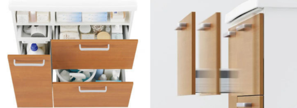 従来デッドスペースになりがちだった排水管の位置を奥にずらすことで、引き出しの収納スペースを大幅に拡大。