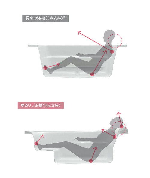 TOTO サザナ:身体を4点で支え、首への負担も少ない「ゆるリラ浴槽」。お湯が冷めにくい「魔法びん浴槽」も標準装備。