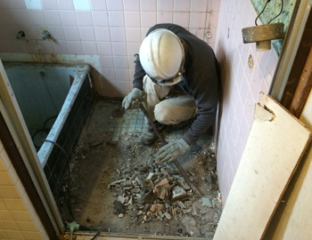 既存のお風呂を撤去し壁も綺麗にしていきます。