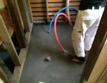土間コンクリート打ち込み後です。ユニットバスへのリフォームの場合は必要な作業となります。コンクリートが乾いた後、いよいよユニットバス組立作業に入ります。組立後、配管・配線の接続をし、壁の目地、浴槽と壁にある隙間に水が入り込まないように、コーキング作業を行っていきます。