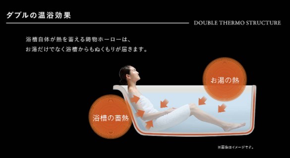 これにより、浴槽とお湯のダブルの温浴効果で体の芯までしっかりと温まり、湯冷めしにくいのが最大の魅力です。
